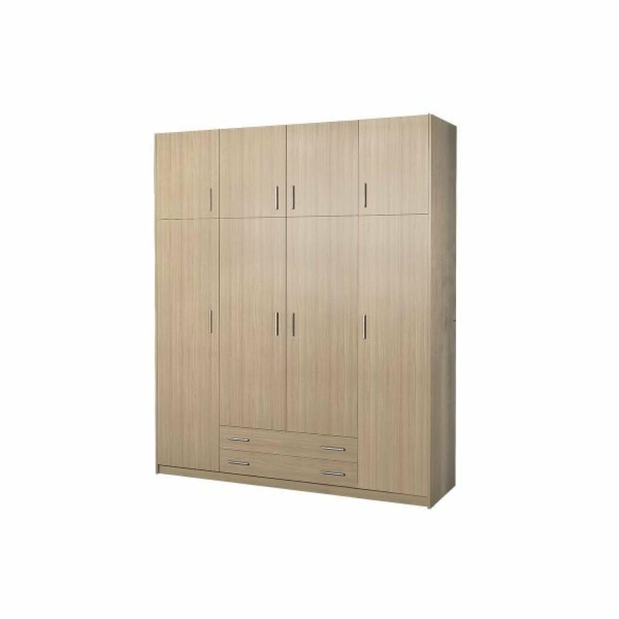 Ελληνικής προελεύσεως τετράφυλλη ντουλάπα η οποία περιέχει 2 μεγάλα συρτάρια με μεταλλικό μηχανισμό, 2 κεντρικές πόρτες με μεταλλικό δοκάρι ειδικά κατασκευασμένο για κρέμαση ρούχων, καθώς και ράφι και δοκάρι στο αριστερό και δεξί φύλλο. Κατασκευασμένη από πιστοποιημένη μοριοσανίδα υψηλής ποιότητας με επικάλυψη μελαμίνης, αποτελεί μια διαχρονική επιλογή με μεγάλους αποθηκευτικούς χώρους για να οργανώσετε πρακτικά κάθε χώρο της επιλογής σας. Με την προσθήκη του παταριού, έχετε στη διάθεσή σας ακόμα περισσότερο αποθηκευτικό χώρο!