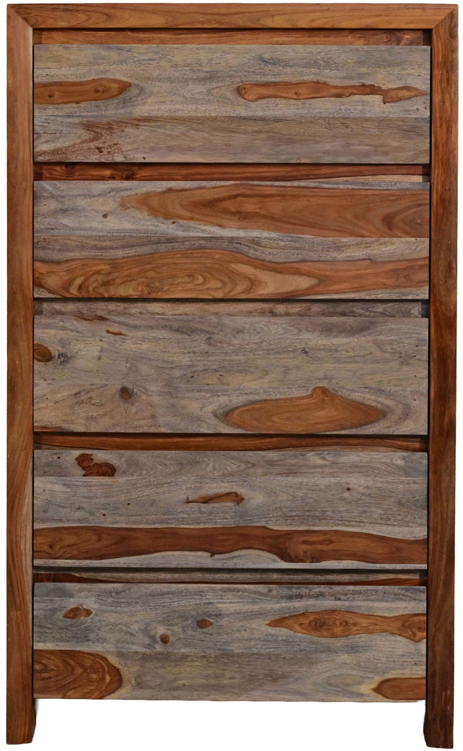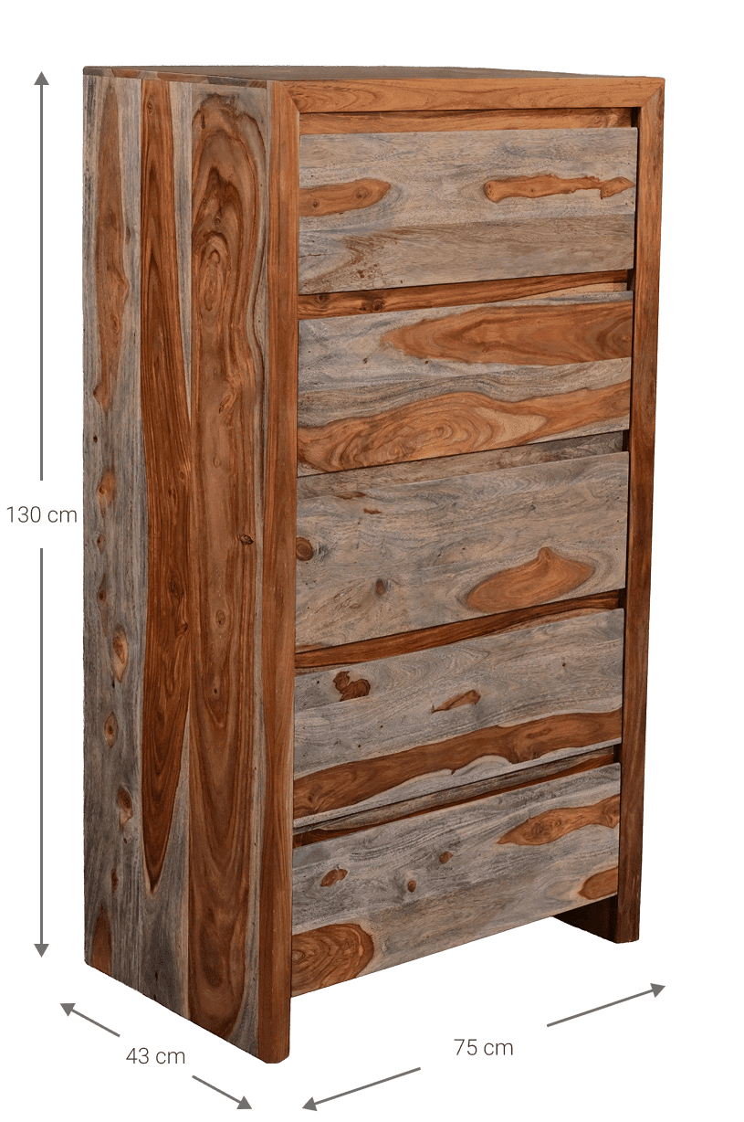Η συρταριέρα Junia συνδυάζει απλότητα και πρακτικότητα, με λιτή γεωμετρία και πέντε ευρύχωρα συρτάρια. Η ανοιχτή καφέ απόχρωση και τα έντονα νερά του ξύλου sheesham αναδεικνύουν τη φυσική της ταυτότητα.