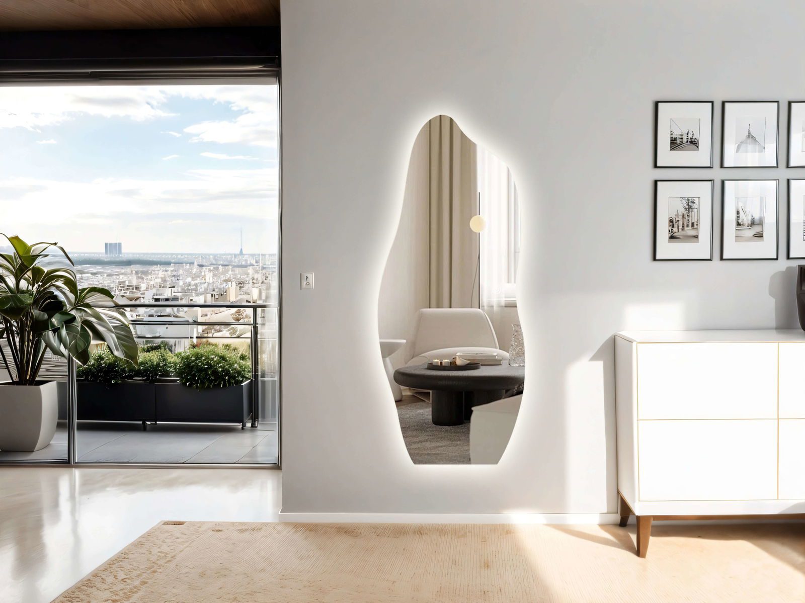 Καθρέπτης Senecio, με ελεύθερη και κυματιστή γραμμή που σπάει τη συμμετρία και προσφέρει μια δυναμική, καλλιτεχνική πινελιά στον χώρο. Ο περιμετρικός LED φωτισμός προσαρμόζεται στην ακανόνιστη μορφή του, χαρίζοντας βάθος και ατμοσφαιρική λάμψη.
