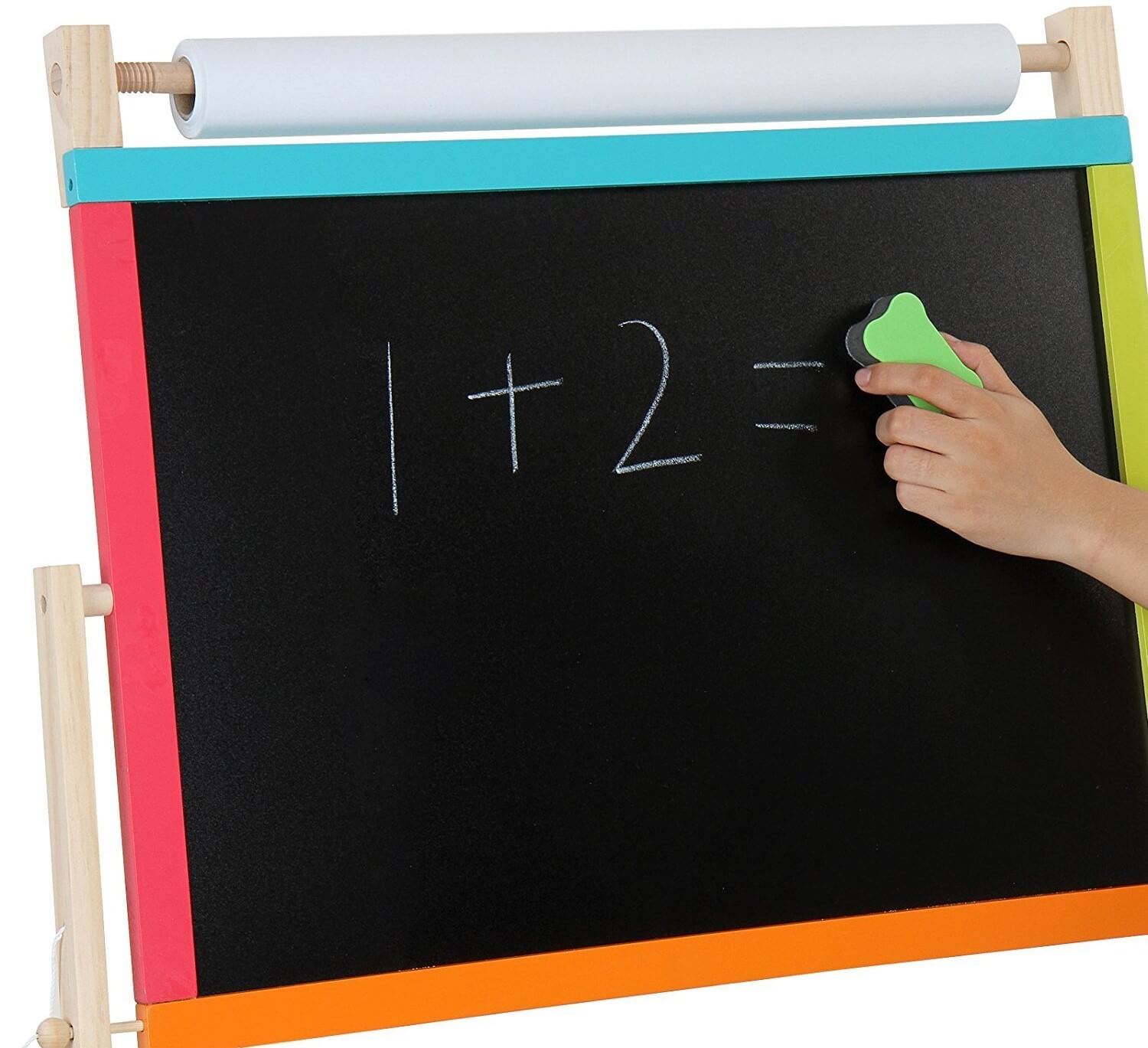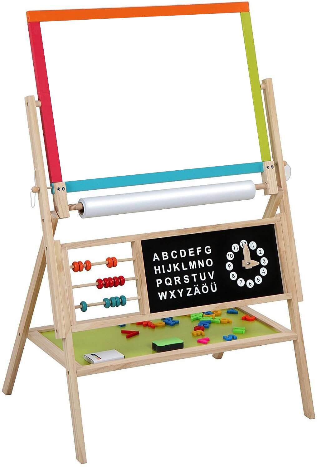 Παιδικός μαυροπίνακας Joyland Alphabet διαθέτει με 2 όψεις, μία με πίνακα κιμωλίας και μία με πίνακα για μαρκαδόρους. Διαθέτει χρωματιστό άβακα, μαγνητικά γράμματα και αριθμούς, κιμωλίες, μαρκαδόρο με σφουγγαράκι, ράφι για την τοποθέτηση μικροαντικειμένων και θήκη για χαρτί ζωγραφικής σε ρολό. Θα προσφέρει αμέτρητες ώρες ψυχαγωγίας στα παιδιά σας και θα τα βοηθήσει να αναπτύξουν την δημιουργικότητά τους και την φαντασία τους.
