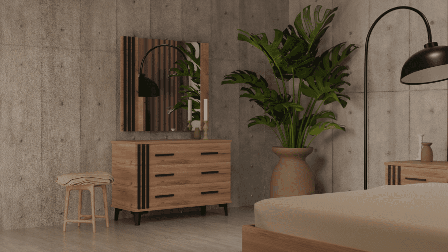 Το σετ υπνοδωματίου “Melody” περιλαμβάνει ένα κρεβάτι “Melody” σε διαστάσεις 160×200 με μεταλλικό ποδαρικό, δύο κομοδίνα, μια συρταριέρα (τουαλέτα) και έναν καθρέπτη.