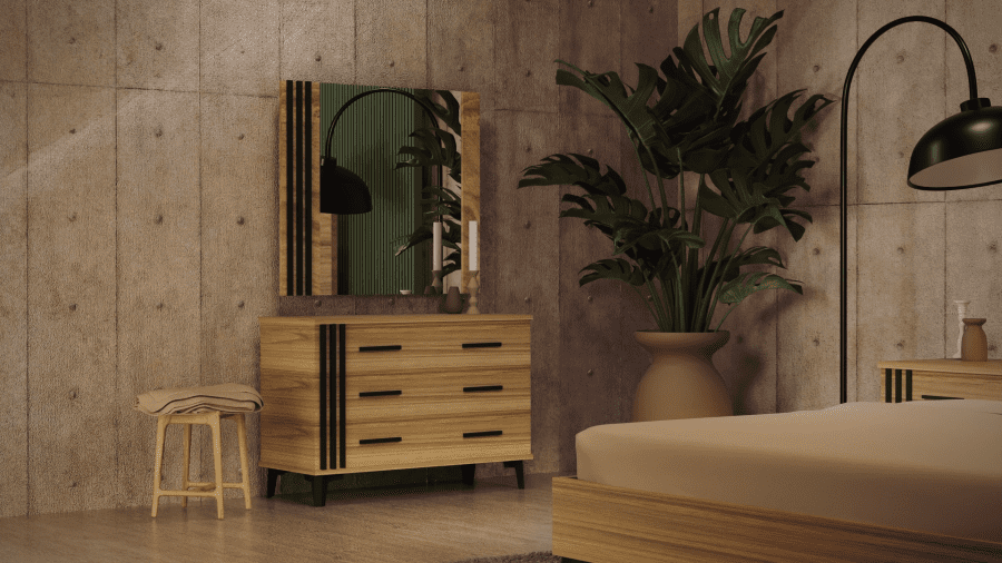 Το σετ υπνοδωματίου “Melody” περιλαμβάνει ένα κρεβάτι “Melody” σε διαστάσεις 160×200 με μεταλλικό ποδαρικό, δύο κομοδίνα, μια συρταριέρα (τουαλέτα) και έναν καθρέπτη.