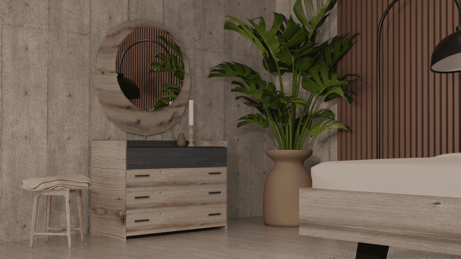 Το σετ υπνοδωματίου “Sierra” περιλαμβάνει ένα κρεβάτι “Sierra” σε διαστάσεις 160×200 με ξύλινο ποδαρικό, δύο κομοδίνα, μια συρταριέρα (τουαλέτα) και έναν καθρέπτη σε χρώμα σταχτί και λεπτομέρειες μαύρη πέτρα.