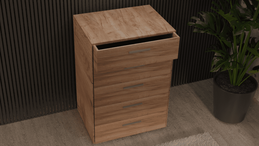 Συρταριέρα ελληνικής προέλευσης, η οποία αποτελείται από 5 συρτάρια με μεταλλικά χερούλια inox. Κατασκευασμένη από πιστοποιημένη μοριοσανίδα υψηλής ποιότητας με επικάλυψη μελαμίνης, είναι ιδανική για χώρους περιορισμένων διαστάσεων καθώς μπορείτε να διακοσμήσετε και να δώσετε μια διαφορετική πνοή στο δωμάτιο.