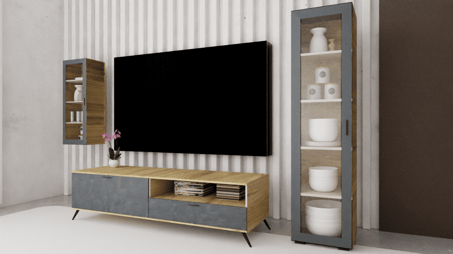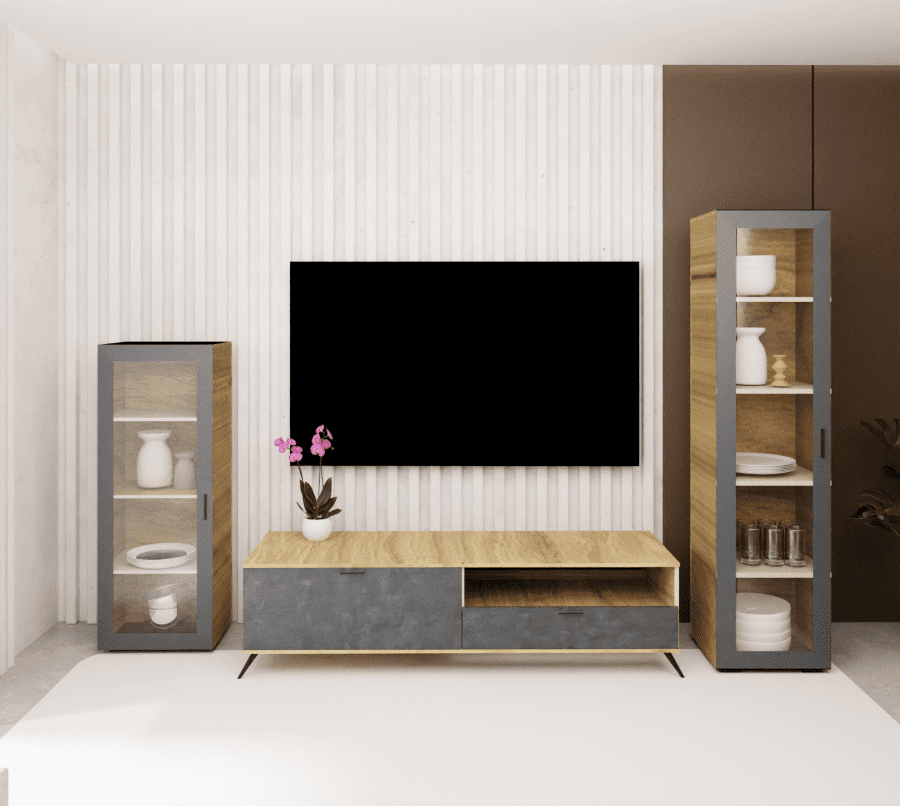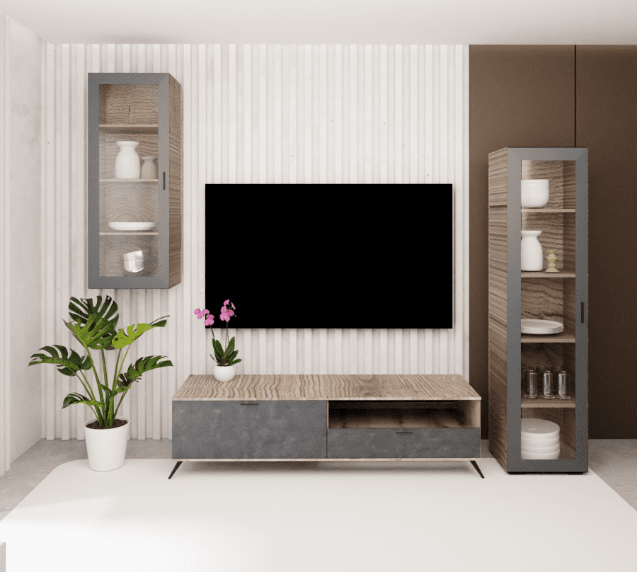 Η σύνθεση είναι κατασκευασμένη από υψηλής ποιότητας μελαμίνη, με ανθεκτικότητα στον χρόνο και τη χρήση, ενώ το χρώμα μελί σε συνδυασμό με τη μαύρη πέτρα δημιουργεί ένα ιδιαίτερο και σύγχρονο αποτέλεσμα που αναβαθμίζει κάθε σαλόνι.